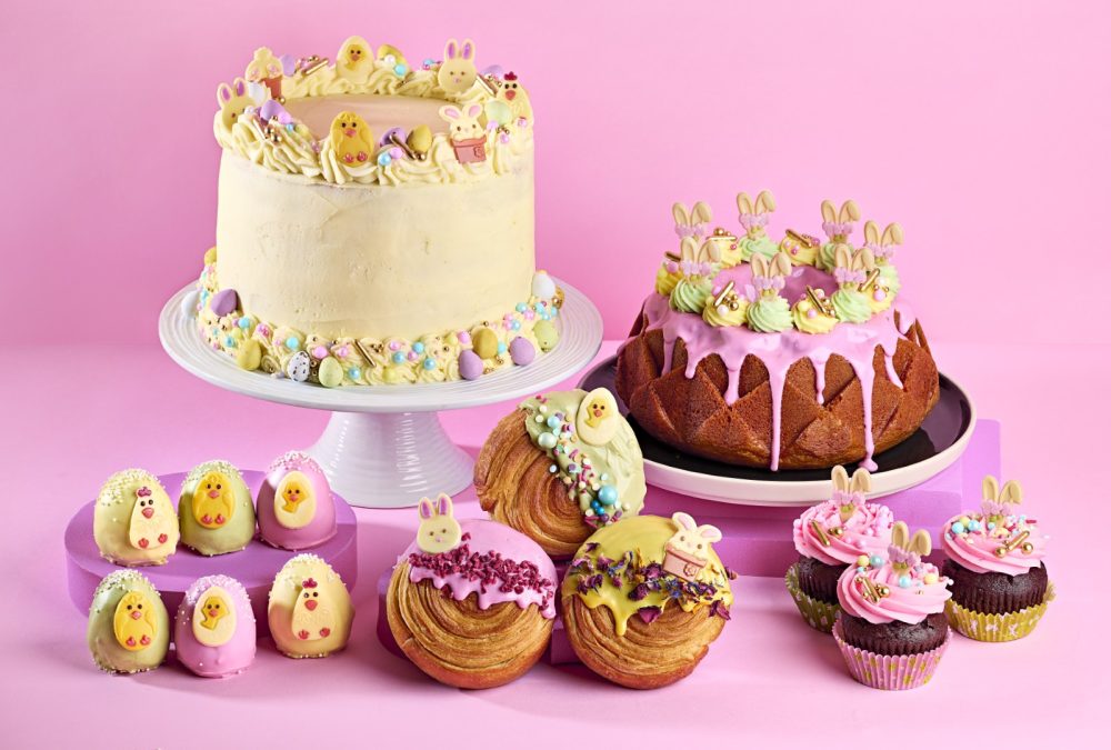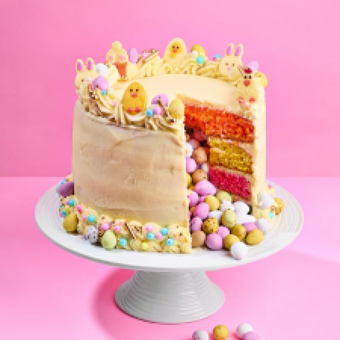 A vibrant cake guaranteed to catch customer's eyes this Easter, with vibrant sponges made with IREKS Moist Cake Plain, layered with Macphie Buttercream, filled with delicious mini eggs and decorated with Dobla Easter decorations!