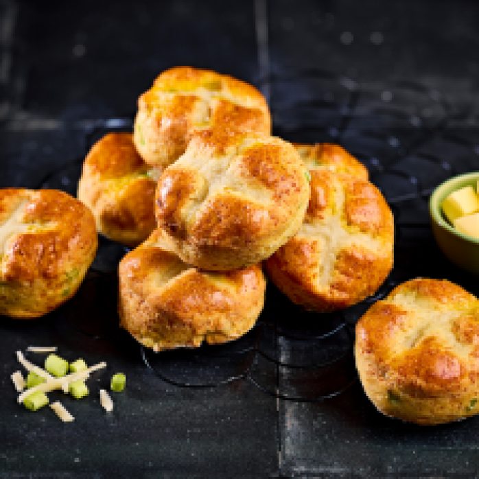 Golden, fluffy and packed with mature cheddar and fresh scallions, these Cheese & Scallion Hot Cross Scones offer a savoury twist on a seasonal favourite best enjoyed warm with butter and perfect for spring offerings.