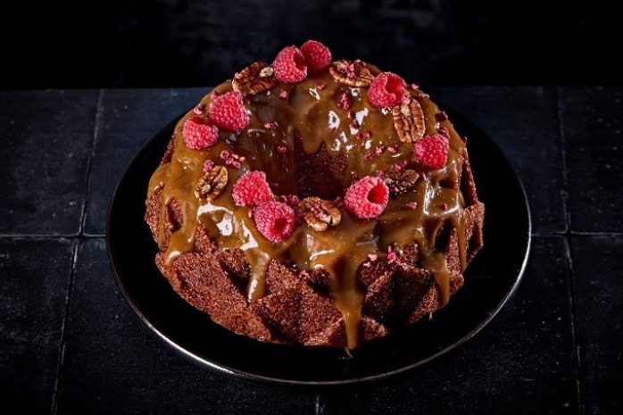 A soft and moist caramel sponge, flooded with even more caramel and finished with raspberries and peacan nuts.