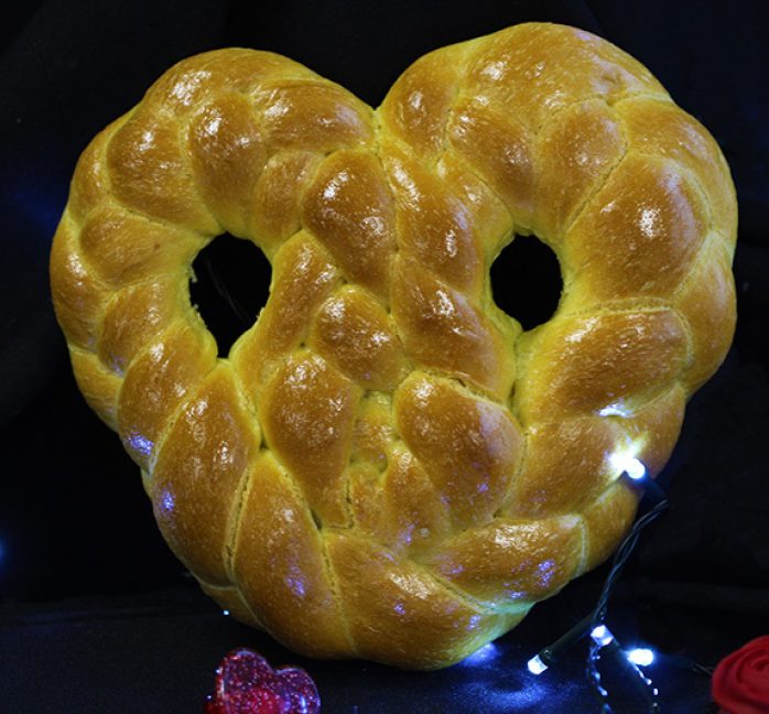IREKS Mella Brioche plaited and shaped into a heart. View Make Up Instructions. Finished with Sonneveld Sonextra Shine.