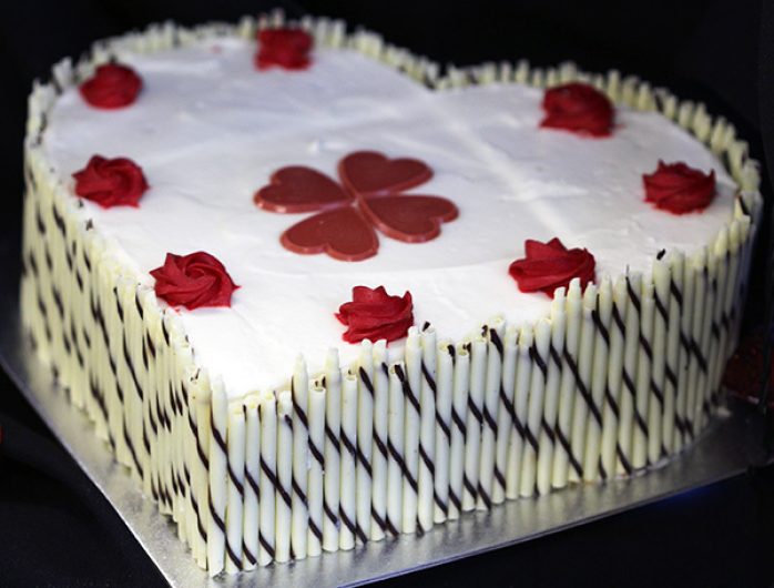 Braun Murbella Shortpastry Mix base iced with Macphie 5th Avenue White Icing, decorated with Dobla Chocolate Heart Red.