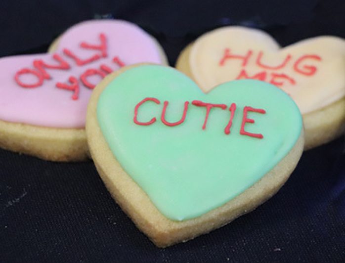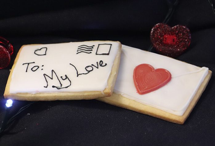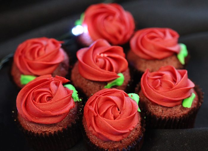 Macphie American Creme Cake Mix layered with Macphie Rainbow Frosting Vanilla. Decorated with Dobla Cigarillo white with dark stripe and Dobla Chocolate Heart Red. Iced with Macphie Rainbow Frosting Vanilla which is also used along with Colour Liquid Fiesta Red to create the iced roses.