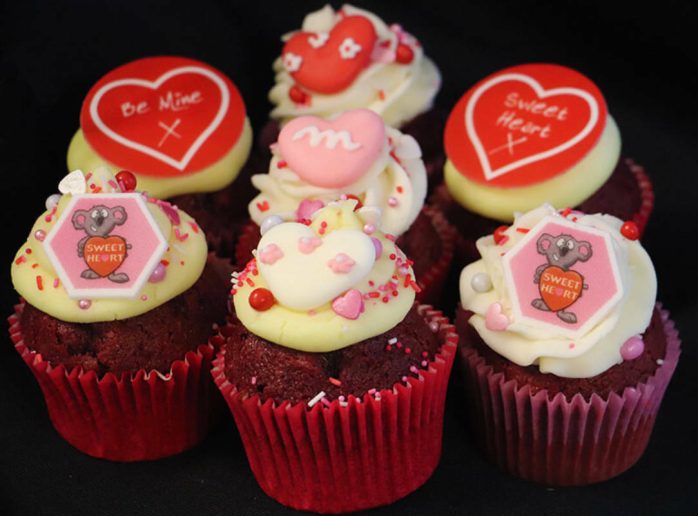 Macphie Red Velvet Cake Mix topped with Macphie Rainbow Frosting Vanilla and Macphie Rainbow Frosting Cream Cheese . Decorated with Valentine Greeting Sugar Plaque and Assorted Hearts Sugar Pipings (see flyer). Cases are Cupcake Cases Red and Cupcake Cases Pink.