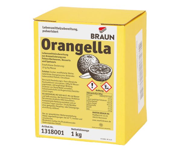 To flavour pound cake, christmas stollen, shortpastry and yeast dough. Usage ratio: 10-15:1000. Add Orangella at the beginning of mixing.