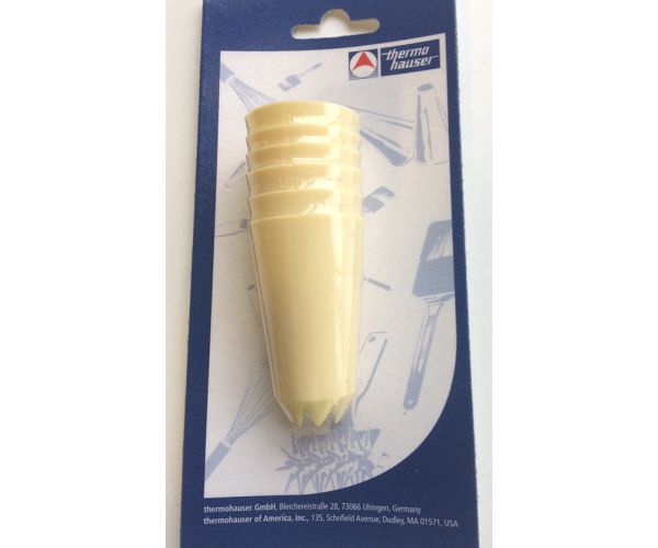 Nylon nozzles for piping and decoration. Star shaped end. Graduated sizes. Diameters: 3, 5, 7, 9, 11, 13mm.