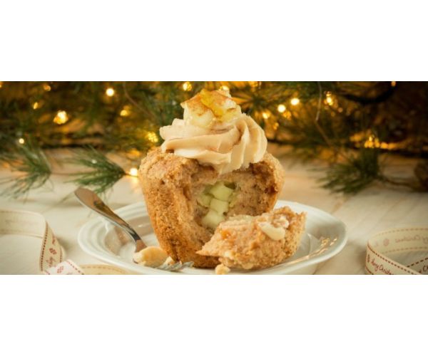Deposit 120g of batter into petal paper cases on muffin trays – pipe 25g of apple filling into batter.