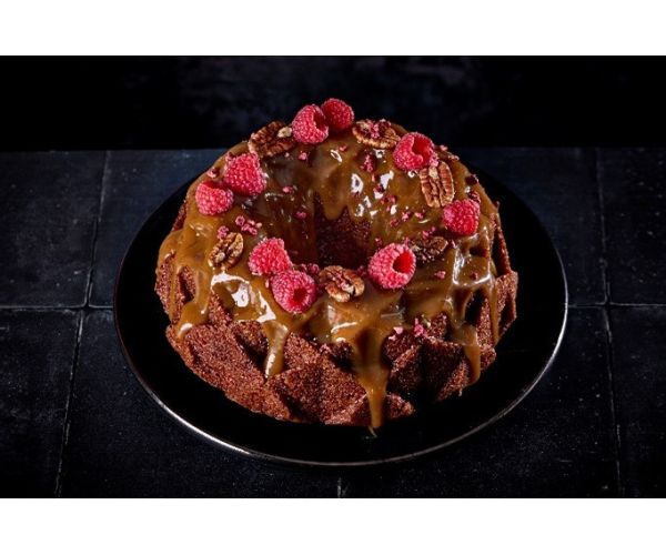 A soft caramel sponge cake drizzled with rich toffee caramel and finished with raspberries, pecan nuts, and freeze-dried raspberries. A perfectly balanced bake combining sweet caramel with a touch of fruit and crunch.