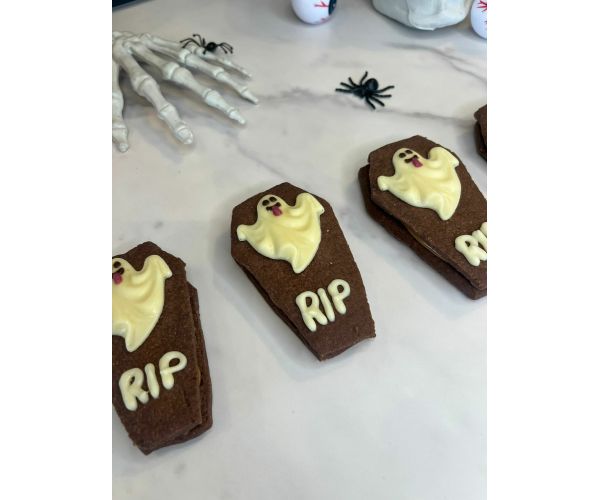 Using Macphie shortbread mix to make these chocolate, coffin shaped biscuits sandwiched with Biscoff spread. Finished with a Dobla ghost.
