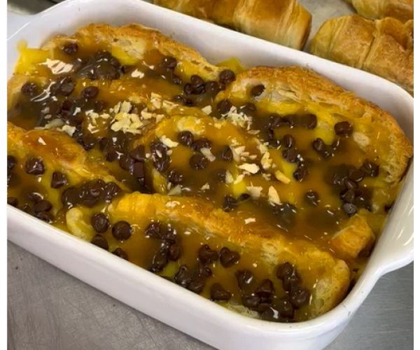 4. Add another layer of halved croissants, custard and remaining chocolate chips.