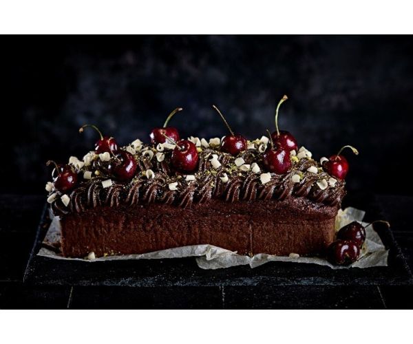 A rich chocolate loaf cake filled with dark cherry fruit filling, topped with smooth chocolate fudge icing and finished with white chocolate curls, crushed pistachios, and cherries. A decadent blend of deep chocolate and fruity sweetness.