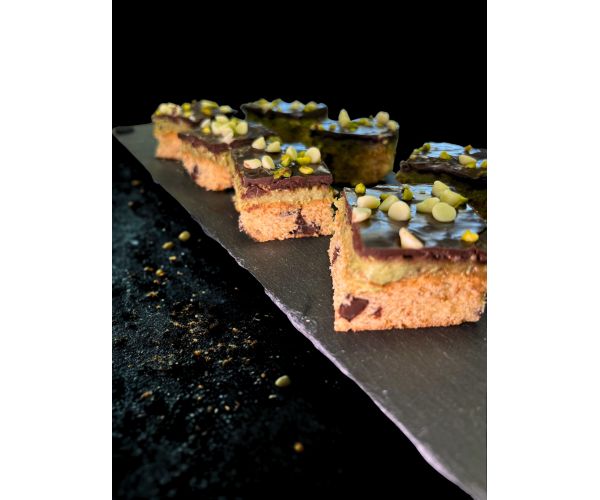 • Melt Kiron Dark and Coverdecor Dark together and spread over the pistachio layer. Finish with chopped pistachios.