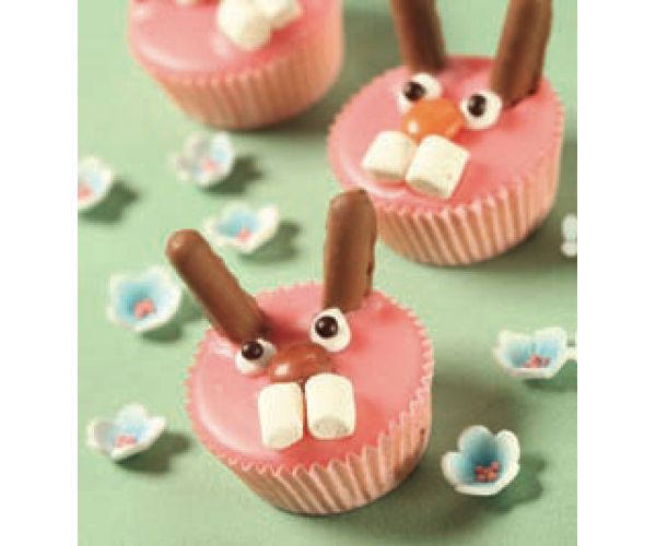 Finishing: Once cool, flood cupcake with melted 5th Avenue® Strawberry Icing, pipe “eyes” using White and Dark Chocolate Icing, arrange marshmallows and biscuits as in picture.