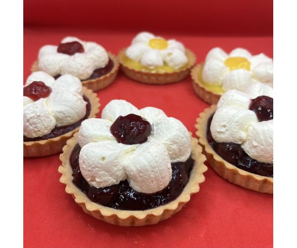 5. Pipe using a large round nozzle, 6 blobs in a flower shape onto of the fruit in the tartlet, and add a blob in the middle using the filling that the tart is.