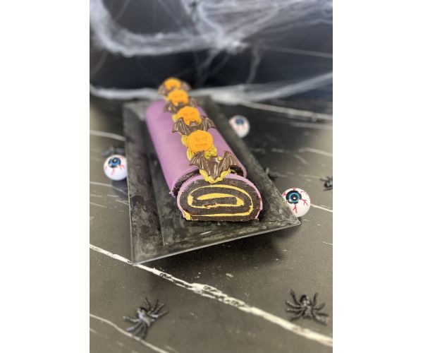 Delicious Macphie chocolate fudge brownie roll with a creamy pistachio filling, covered in IRCA white chocolate coverdecor and Dobla's scarily sweet decorations.