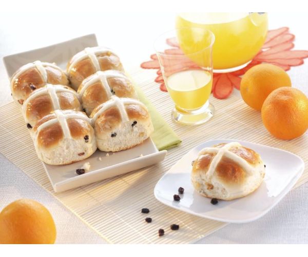 After the intermediate proof, divide into 30 pieces, mould round, place the dough pieces slightly apart on greased trays and allow to prove. Wash with egg at ¾ proof, add the cross and bake.