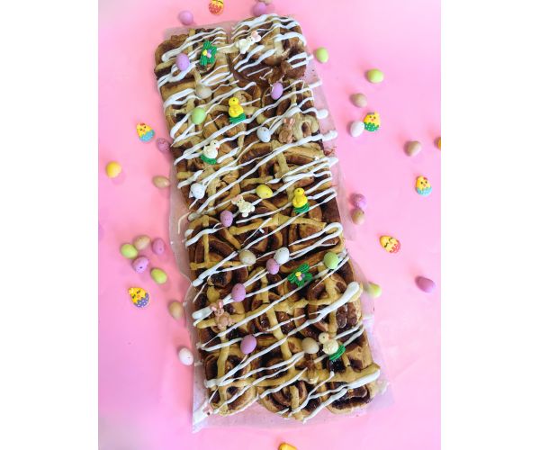 10. Heat white icing until runnier consistency, add to the cinnamon rolls. Decorate with more chocolate eggs and Culpitt Easter decorations