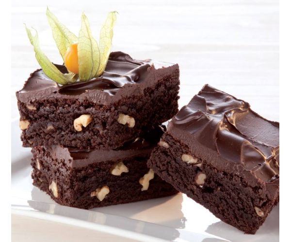 If desired, add the walnuts at the end of the mixing time. Spread the batter on a tray and bake. After cooling, cover with chocolate icing and if desired, decorate with pieces of walnut.