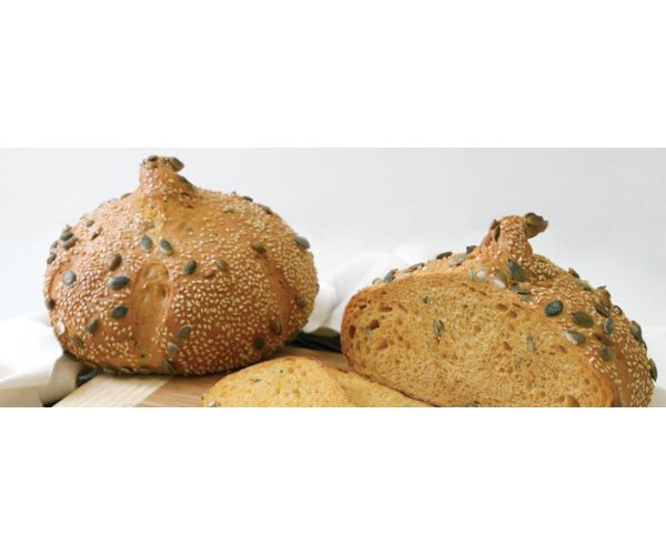 Mould round like a pumpkin and use sesame and pumpkin seeds as a topping. Cut the dough piece from bottom to top 6 times at ¾ proof to give the pumpkin appearance. Then return to the fermentation chamber for the final proof.