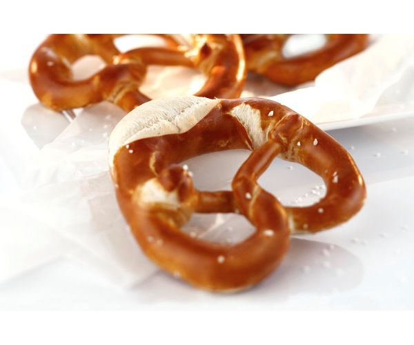 After the intermediate proof, divide the dough pieces and mould long into sticks. Process the sticks into pretzels and allow final proof. After the subsequent stiffening time, dip the dough pieces briefly into pretzel lye, place on trays with paper, sprinkle with salt, cut and bake immediately without steam with open damper.
