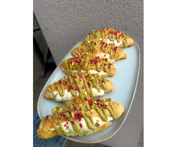 5. Heat remaining (200g) pistachio spread until it is a runnier consistency. Pipe over the croissants. Whilst the spread is still warm decorate with pistachios and raspberry pieces