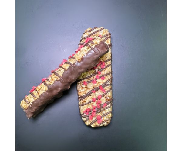 Crispy cereal bar with raspberry and orange pieces, dipped and drizzled in delicious (and cost effective!) Kiron Dark Drops, perfect for customers on the go