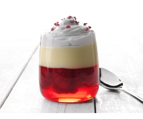 Pipe 100g Bon Vanilla onto the jelly and spread crumbs on top.