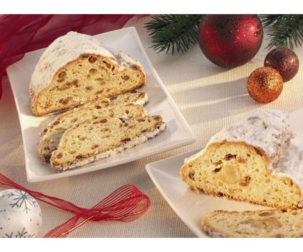 After the second bulk fermentation time, add the fruit mixture slowly within approx. 3 minutes to the dough. Scale the stollen dough into pieces of 1 kg, mould round, roll long and process into stollen or place in greased stollen tins. After approx. 15 minutes proof, bake in a deck oven at approx. 200° C for approx. 75 minutes with lid. After baking, wash with liquid butter on all sides and toss in granulated sugar. After cooling completely, dust with icing sugar.