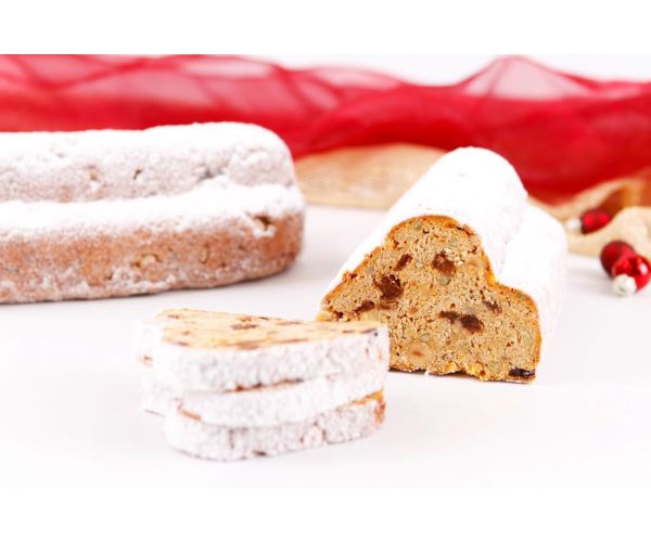 - Scale the dough in 0.800Kg portions, mould round, roll long, process into stollen or place in greased stollen tins