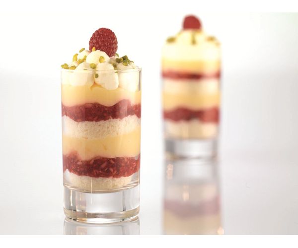 For the custard cream, mix the water with the IREKS PREMIUM CUSTARD for 3 minutes until smooth. Then layer the sponge, fruit and cold cream alternately on top of one another and decorate with whipped cream.