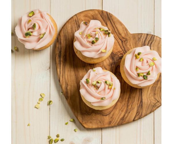 Allow to cool and decorate with Vegan Vanilla Frosting flavoured with rosewater and topped with chopped pistachio nuts